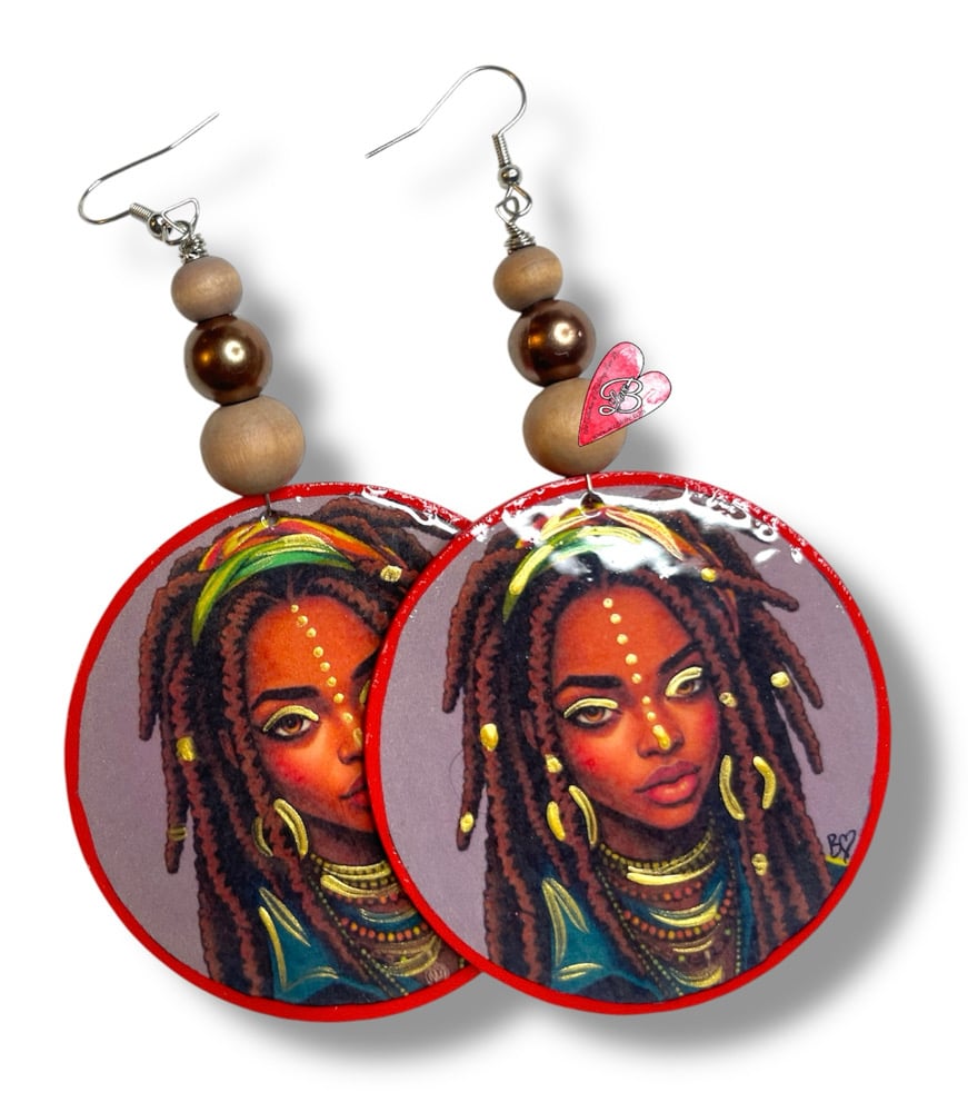 African Loc Goddess earrings. Unique one of a kind Digital artwork designed by B Love Handmade Gold accents Wooden beads Red wood This pair faces each other