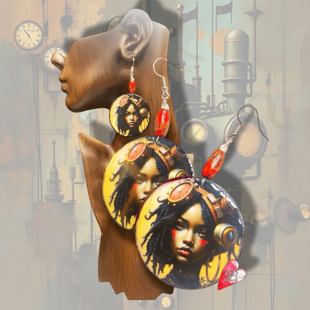 Steampunk fashion earrings. Unique one of a kind Digital artwork designed by B Love Handmade Wooden beads Black backside
