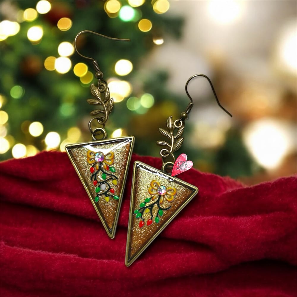 These are handmade, one of a kind antique bronze Christmas-themed dangle earrings that feature an image of holiday lights and a bow encased in resin within a triangle frame. The earrings also have a small leaf accent on the hook.