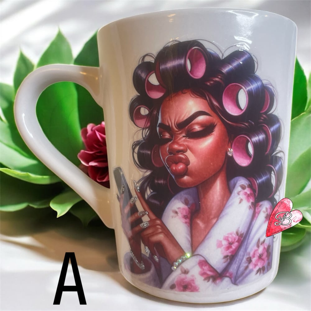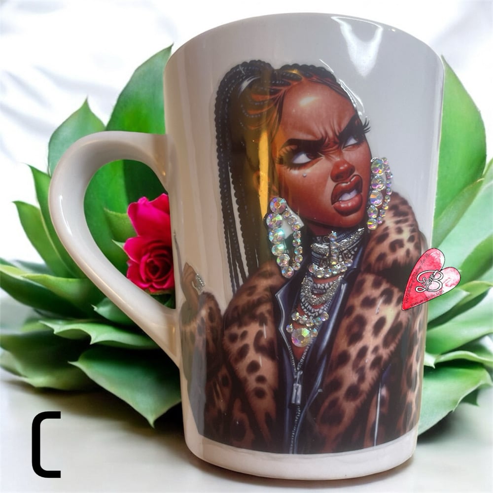 These mugs features stunning 3-D mixed media art, with enchanting black sisters making mean mug faces with a touch of rhinestone embellishments for that extra sparkle and charm.