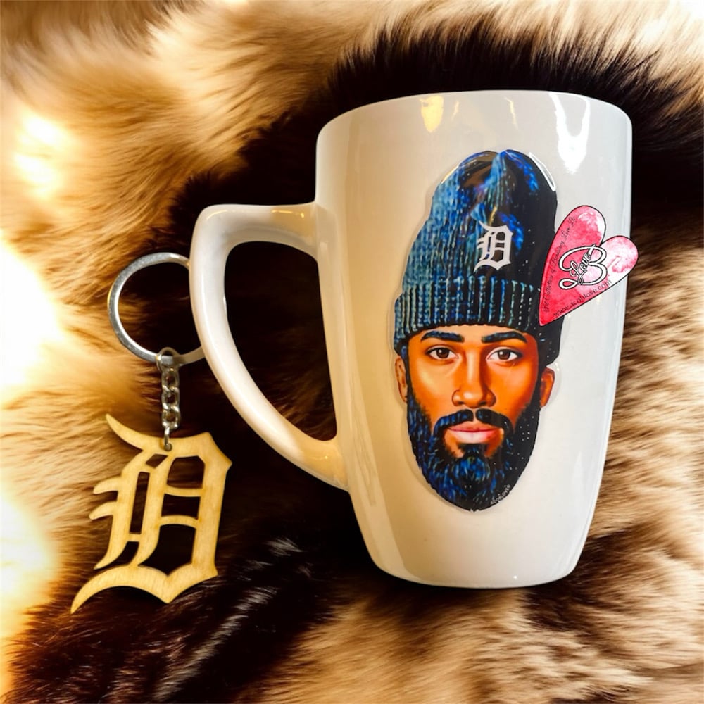 The mug features a 3D mixed media art illustration of a full bearded man wearing a skull cap with Detroit D.