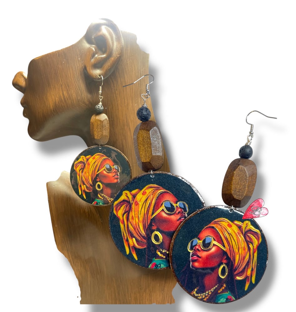 Headwrap Queen earrings. Unique one of a kind Digital artwork designed by B Love Handmade Gold accents Vintage beads Brown Wood This pair faces each other