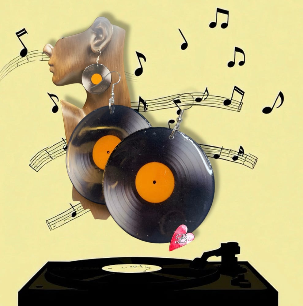 Retro Vinyl Look Earrings! Handmade Light orange circle in the middle Available in sizes: 1-1/2” Length 2” Length Wood Coated with Resin Black painted in the backside Lightweight Nickel free